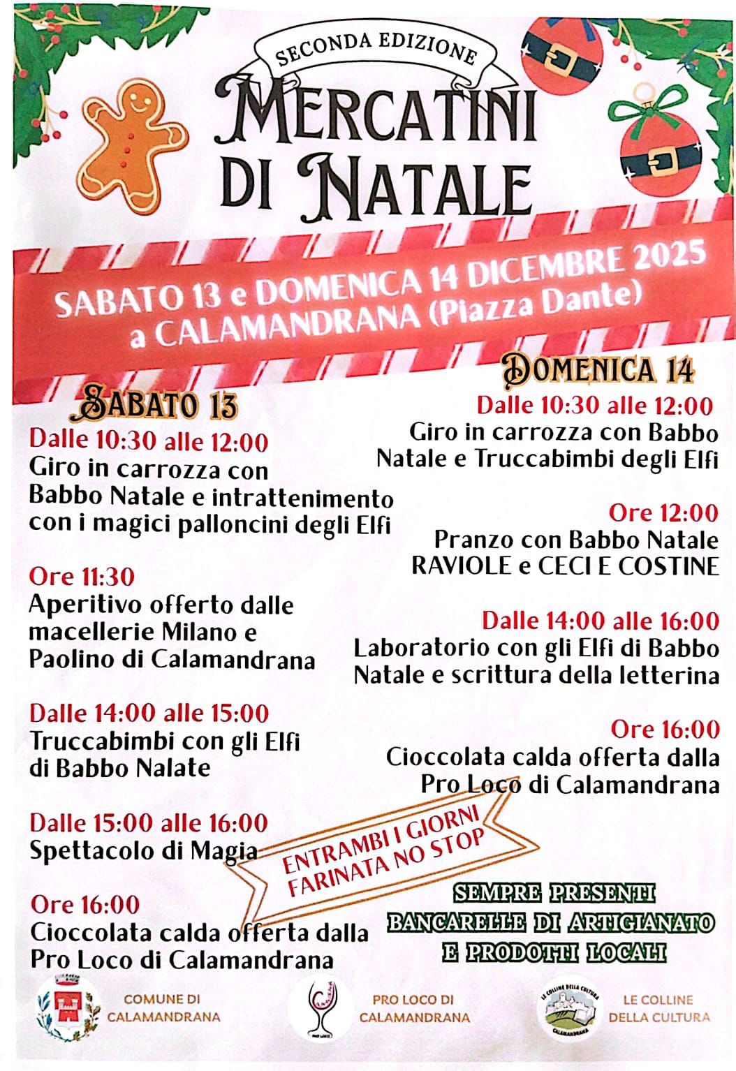Sabato 13 e domenica 14 dicembre 2025, in piazza Dante, a Calamandrana, sono in programma i mercatini di Natale di Calamandrana.